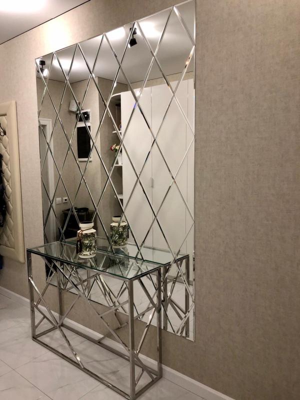 Чаще всего зеркальная плитка нужна для расширения пространства и насыщения его светом. Эти задачи отлично решаются при помощи покрытия целой стены или создания крупной композиции. Чтобы было эффектнее, прибегают к ромбической или мозаичной схеме раскладки.